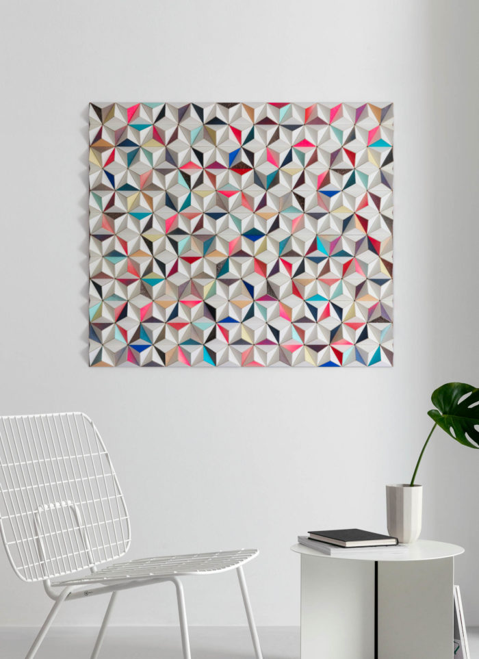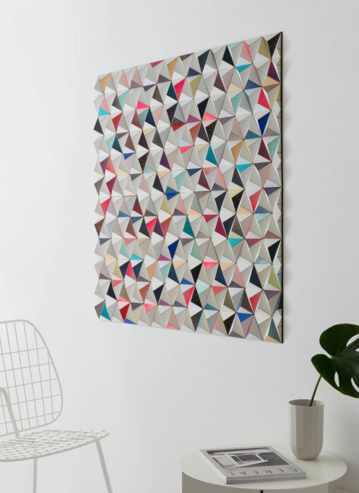 Design: The HIS-3 TOPOGRAPHIE is a modern and timeless design object. With its combination of three-dimensionality and colour it will set new architectural and artistic standards in your interior design. It is dark-coloured and rich in contrast at the same time and thus suitable for a bright as well as a dark background. The playful combination of colours is universally compatible with different styles of interior design and comprises along its main colour silver-grey various colour accents in glitter blue, turquoise, pink, bronze, icewhite, light yellow, mirror and other special shades. Its shape matches sofas, sideboards and tables in living areas as well as in the workspace. The dodecagon consists of 2430 coloured triangles that are put together by hand – making each piece unique.