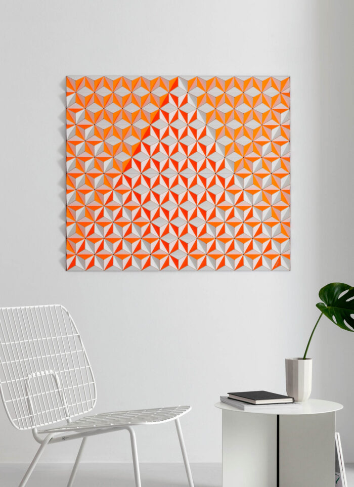 Design: The HIS-3 TOPOGRAPHIE is a modern and timeless design object. With its combination of three-dimensionality and colour it will set new architectural and artistic standards in your interior design. It is dark-coloured and rich in contrast at the same time and thus suitable for a bright as well as a dark background. The playful combination of colours is universally compatible with different styles of interior design and comprises along its main colour silver-grey various colour accents in glitter blue, turquoise, pink, bronze, icewhite, light yellow, mirror and other special shades. Its shape matches sofas, sideboards and tables in living areas as well as in the workspace. The dodecagon consists of 2430 coloured triangles that are put together by hand – making each piece unique.