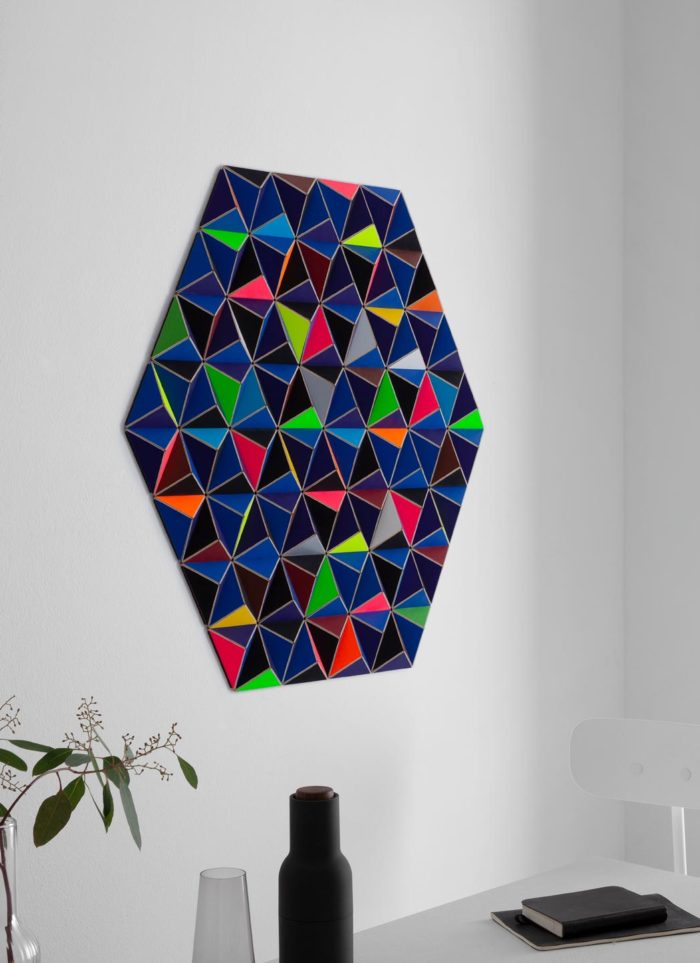 Design: The HIS-6 TOPOGRAPHIE, dedicated to minimalism, is an elegant and timeless design object. With its combination of threedimensionality and colour it will set new architectural and artistic standards in your interior design. The fine color nuances and the simple rotation of several tetrahedrons renders this design especially striking. The combination of velvet black and off-white is exceptional and atmospheric. This wall sculpture is dominated by subtle changes while the beholder walks past it. The rectangle consists of 1728 triangles that are put together by hand – making each piece unique.