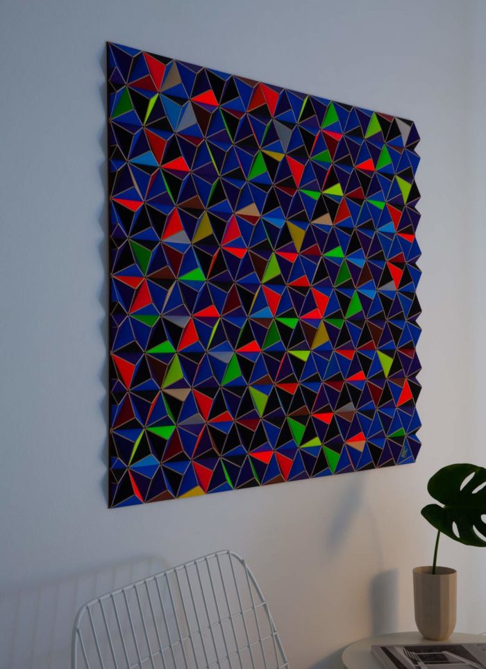Design: Die AIS-4 TOPOGRAPHIE ist ein modernes und zeitloses Designprodukt. Mit ihrer Kombination aus Dreidimensionalität und Farben setzt diese Wandtopographie neue architektonischkünstlerische Maßstäbe in Ihre Raumgestaltung. Die Farben sind dunkel und kontrastreich zugleich, diese Wandtopographie passt besonders gut zu hellem Hintergrund. Die verspielt-bunte Farbkombination ist universell kombinierbar mit verschiedenen Einrichtungsstilen und beinhaltet, neben ihrer Hauptfarbe Schwarz, die leuchtenden Neonfarben – Gelb, Pink, Grün und Orange sowie die Farben – Blau, Rot, Beige, Schwarz und Silber. Das Format harmoniert sehr gut, sowohl in Wohnräumen als auch in Arbeitsräumen, mit Sofas, Sideboards und Tischen. Das Rechteckformat besteht aus 864 farbigen Dreiecken, die per Hand im Zufallsprinzip zusammengesteckt werden – jedes Werk ist ein Unikat.